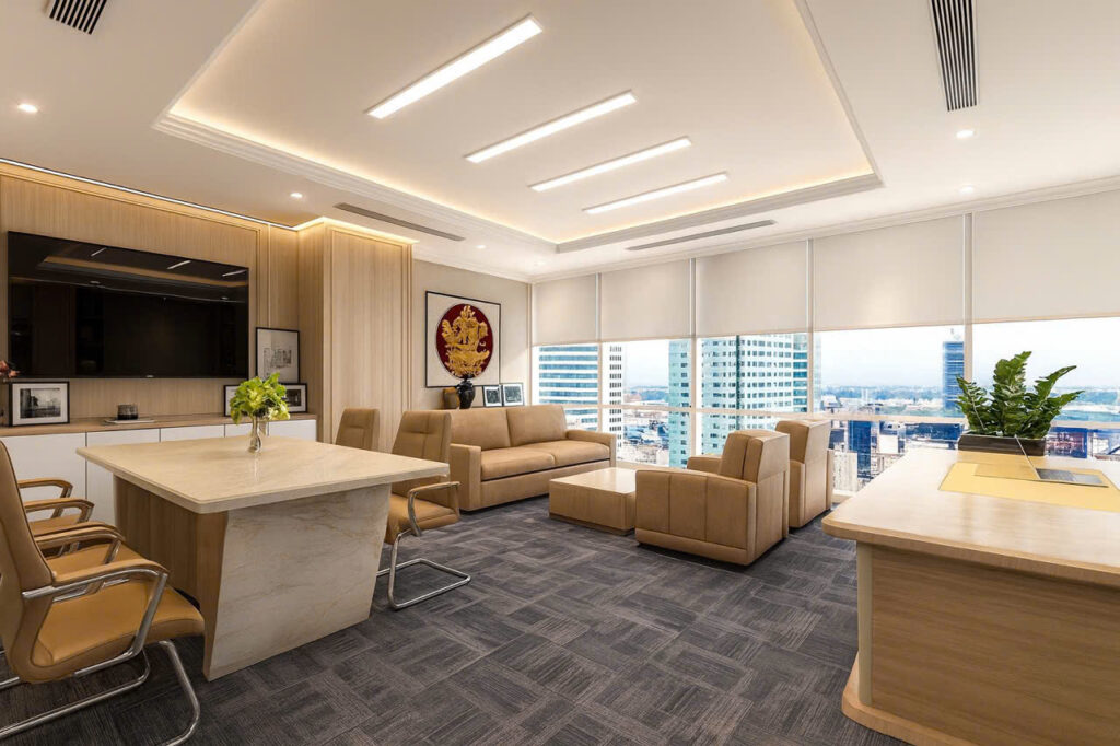 Đối với văn phòng giám đốc, phòng trưng bày, hay khu vực lễ tân – trần thạch cao cấp là lựa chọn giúp tăng chiều sâu và tính thẩm mỹ cao cấp .