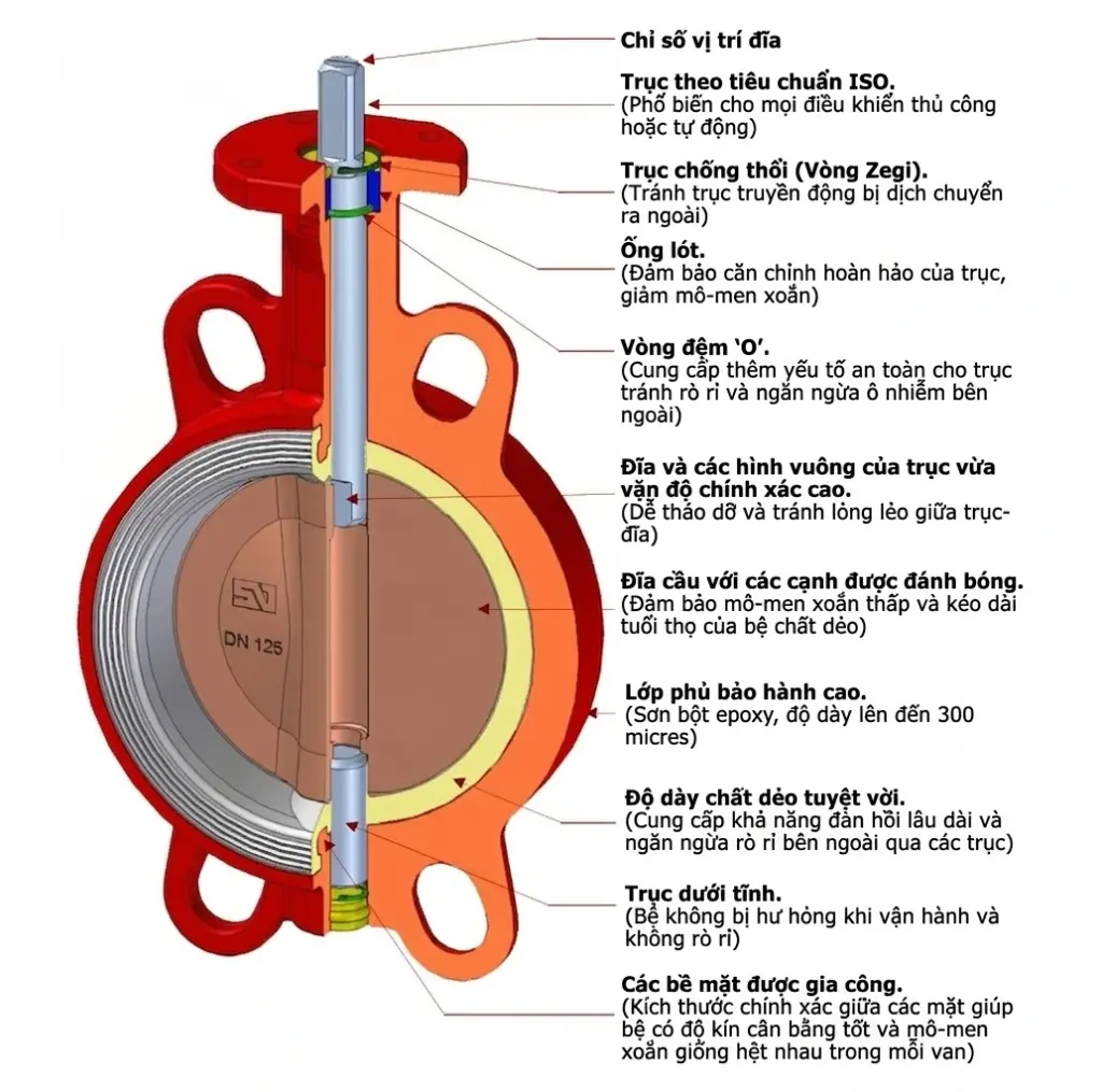 - Vật liệu chế tạo: Các mác vật liệu tiêu chuẩn cấu thành thân, đĩa, trục và gioăng, quyết định khả năng chống ăn mòn hóa học và độ bền cơ học.