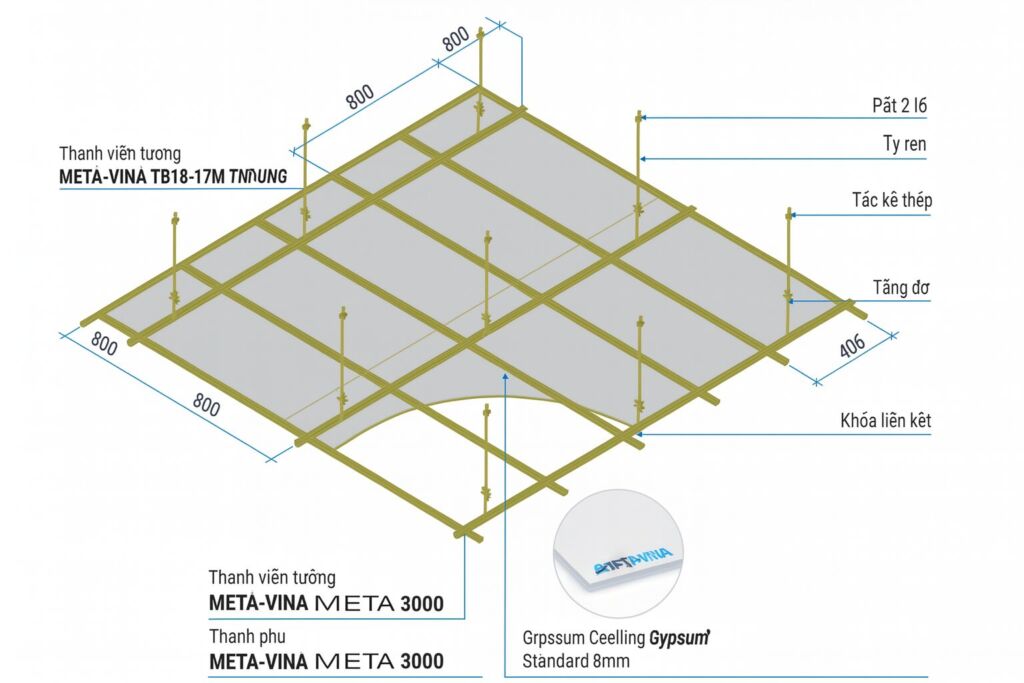Với định hướng chất lượng – bền vững – chuẩn kỹ thuật , META VINA cung cấp hệ khung xương trần thạch cao đạt tiêu chuẩn , giúp: