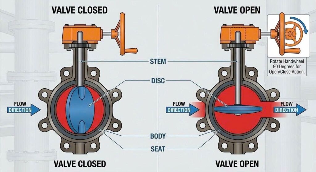 Nguyên lý hoạt động của van bướm rất trực quan nhưng đạt hiệu quả kỹ thuật cực cao: