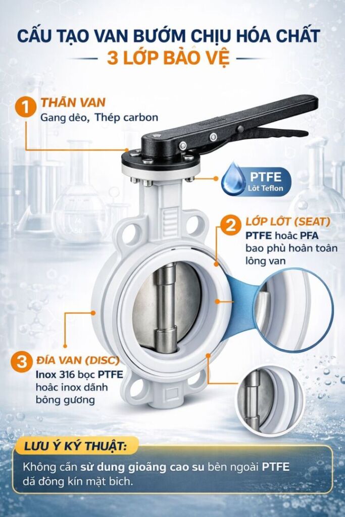 Để vận hành tốt trong môi trường khắc nghiệt, một chiếc van bướm lót Teflon tiêu chuẩn thường có cấu tạo 3 lớp bảo vệ: